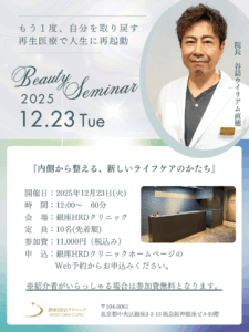 今回のセミナーでは、院長の谷詰直穂が、最新の再生医療についてわかりやすく解説し、体の内側から美と活力を引き出す新しいケアのかたちをご紹介します。